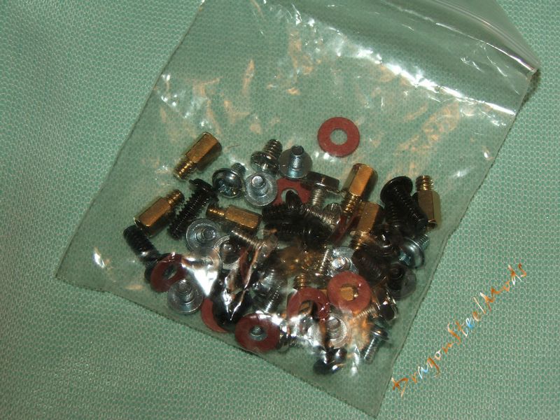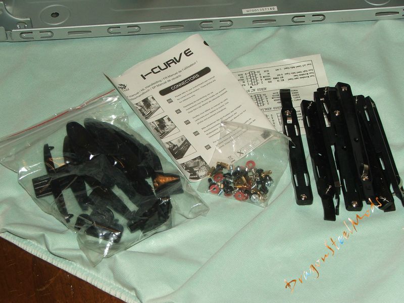 Inside the accessory box is a brief manual, tool-less brackets for the optical and hard drives, a mini-speaker, optional metal lock for case, and of course a bag of assorted screws, stand-offs and washers.