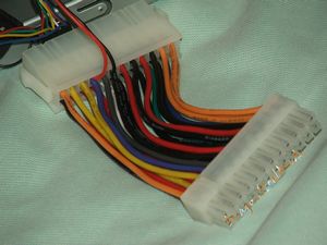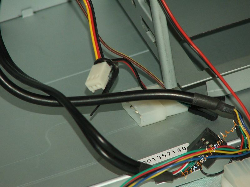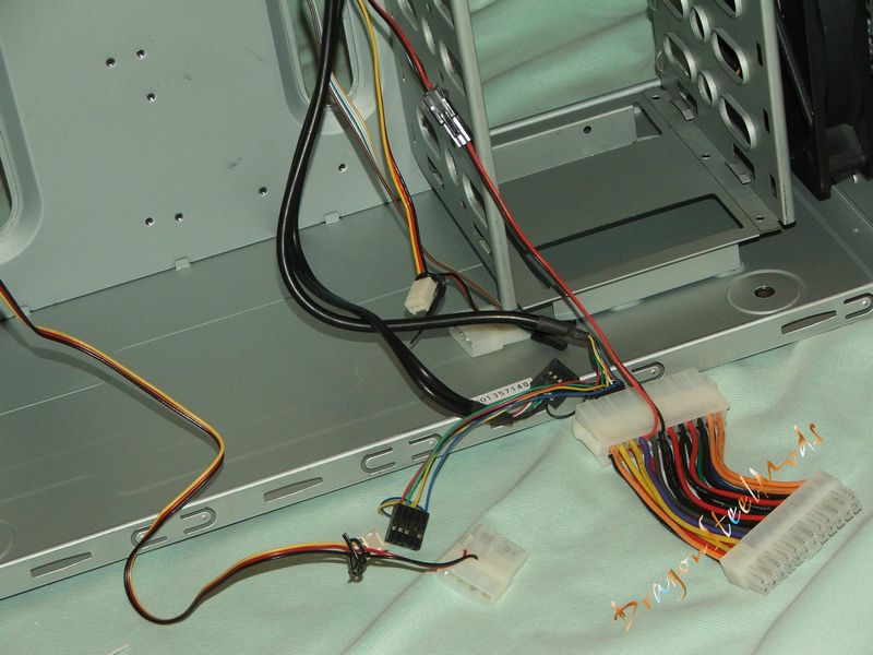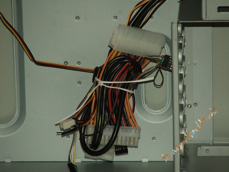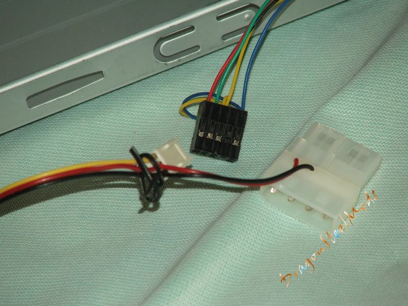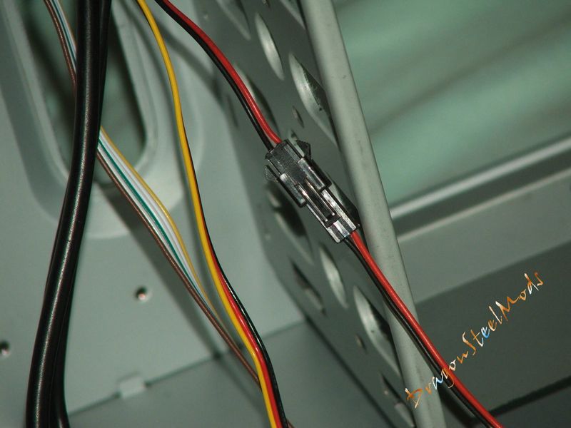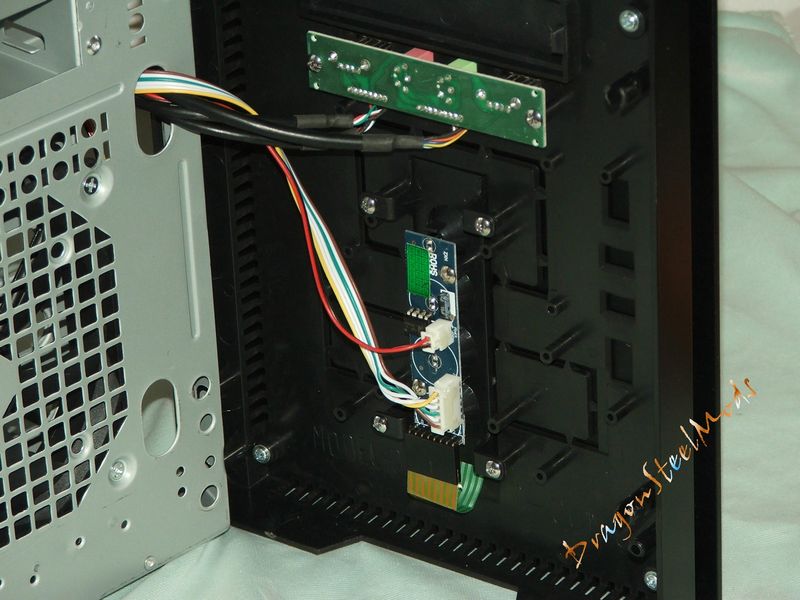 The second thing that you'll notice quickly is what look to be an ATX adapter hanging in the back of the case, this is used as a pass-through from the PSU to your motherboard, this allows a trickle of power to continuously be fed to the touch panels so you can activate the touch panel when the system is powered off. We also find the standard header connections hanging here as well, along with the fan connections that are actually dual powered, you can use the Molex or 3-pin connection ot power the fans.