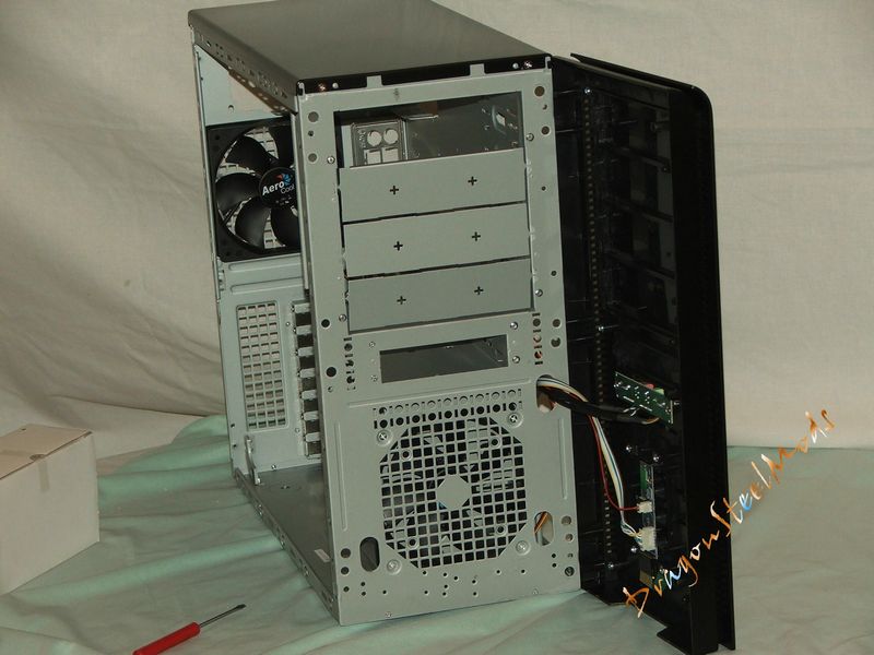 Once the side is off we can get a nice look at the inside, the first thing you'll notice is a white box stuck up in the 5.25” bays, that of course is the accessory box.