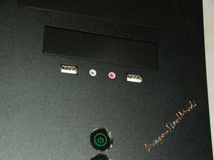 Externally we've got four 5.25” bays and one 3.5” bay, along with two USB ports and connections for headphones and microphone.