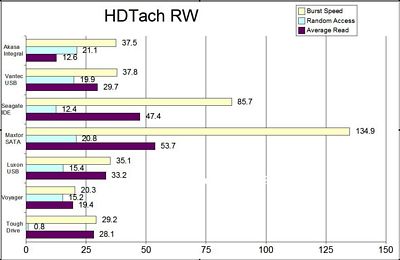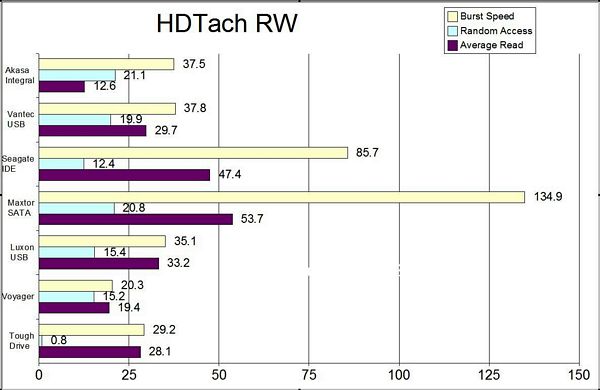 With HD Tach, the higher scores are better for Burst Speed and Average Read while lower is better for Random Access. I’ve included other enclosures, standard 3.5 IDE and SATA drives as well as a couple USB thumbdrives for comparison in the graph.
