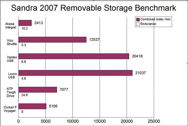 Next up is SiSoft Sandra 2007 Removable Storage Benchmark, here higher scores are better for both benches and I did included other portable storage devices as well for comparison.