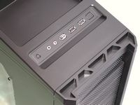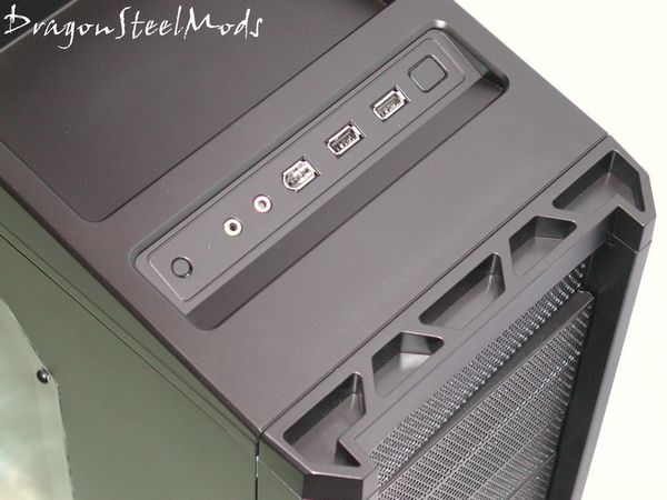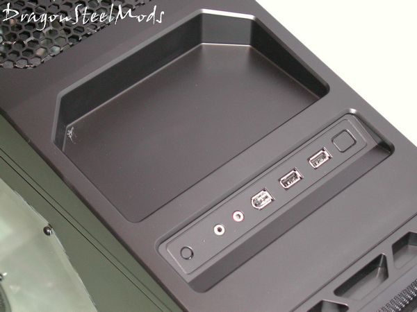 On the top of the case is also where the USB, Firewire, and Audio ports are located. The power and reset buttons are here as well, along with a tiny blue LED to indicate HDD activity.