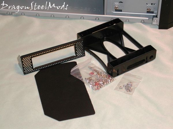 The accessory bag contains all the mounting screws, 5 1/4” to 3 1/2” bay adapter, front cover for the 3 1/2” bay device and the rubber pad for the tray on top of the case.