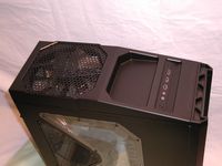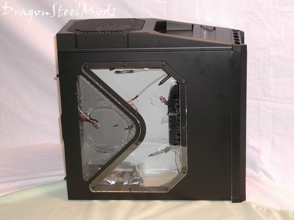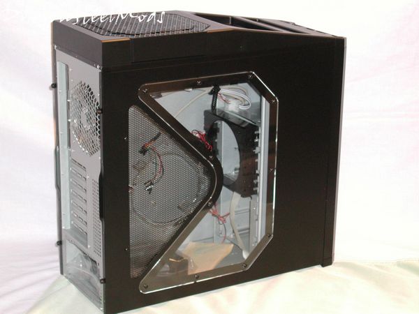 From the side view we can see the interesting shape of the window, the optional 120mm side fan mount and into the case a bit. The window let's you basically see into the case to show off your motherboard and video card, but not to see the hard drives etc.