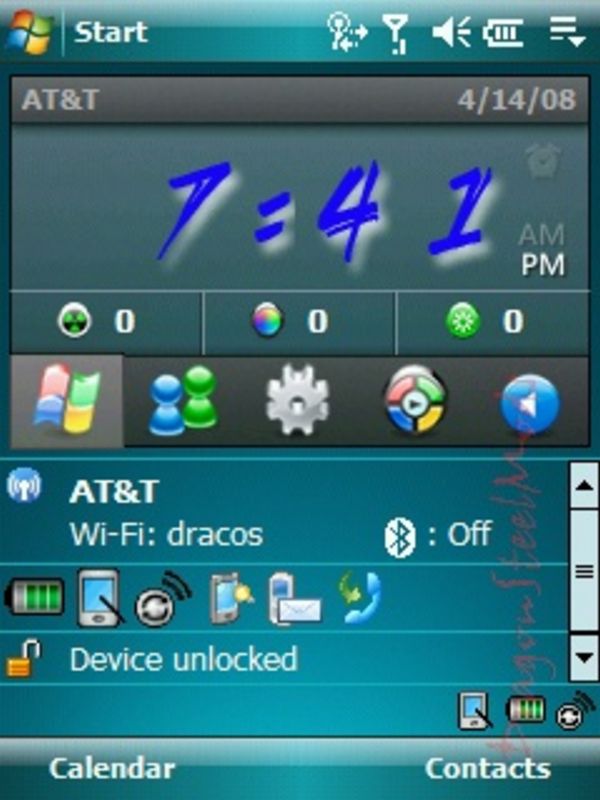 Here's my Today Screen the way it looks now, it's a re-styled HTC home screen, the middle icons open up different options. You can have the weather on there to, but I opted not to as I can stick my head out the door and know what the weather is…