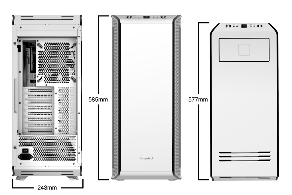Dark Base Pro 900 White Edition is a technical masterpiece, and stands out due to its high-quality materials and design. Smooth aluminum surfaces and a robust steel construction lead to extraordinary elegance and stability. Additionally, be quiet!’s high-end premium chassis is equipped with a decoupled side window made of tempered tinted glass, includes easily positioned LED strips to illuminate the interior in five different colors, and an inductive charging station for wireless charging of smartphones and other Qi-compatible devices.