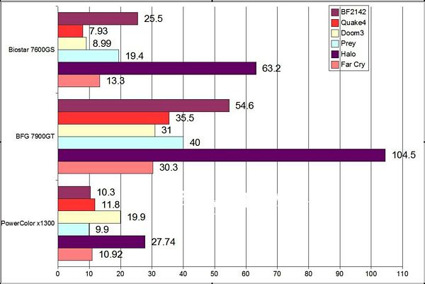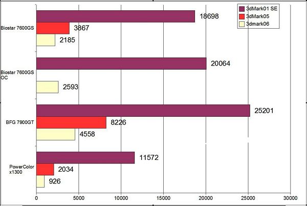For the comparison I’ve included scores for a BFG 7900GT OC (the higher end card) and a PowerColor x1300 (a comparably priced competing budget card)