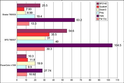The specs for the 7600GS are about the same, actually the PowerColor runs 50Mhz faster on the core than the 7600GS. The 7600GS though has 12 pipes superscaler as to the 4 pixel pipelines of the X1300.