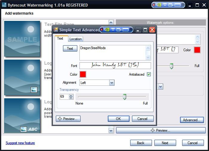 You have several types of watermarks you can use, and you can customize them with positions, size, fonts and transparency as well. You can even preview how your watermark will look before you process it to your pictures.
