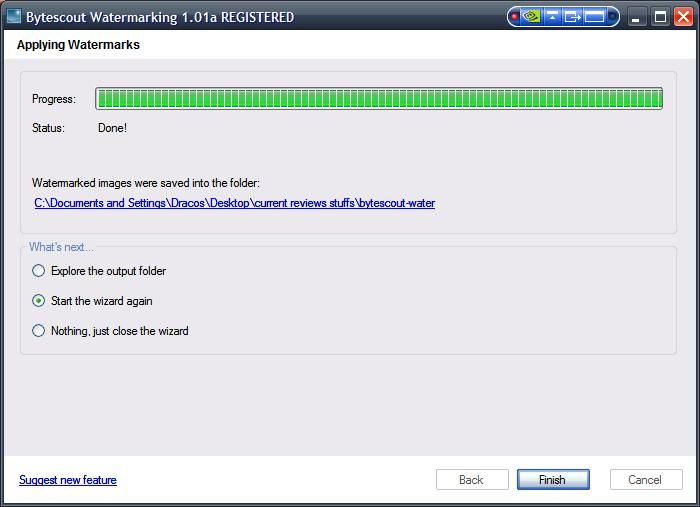 Click the Start button and it the software will start to process your pictures, in a few seconds you're done and ready to work with your new watermark protected pictures.