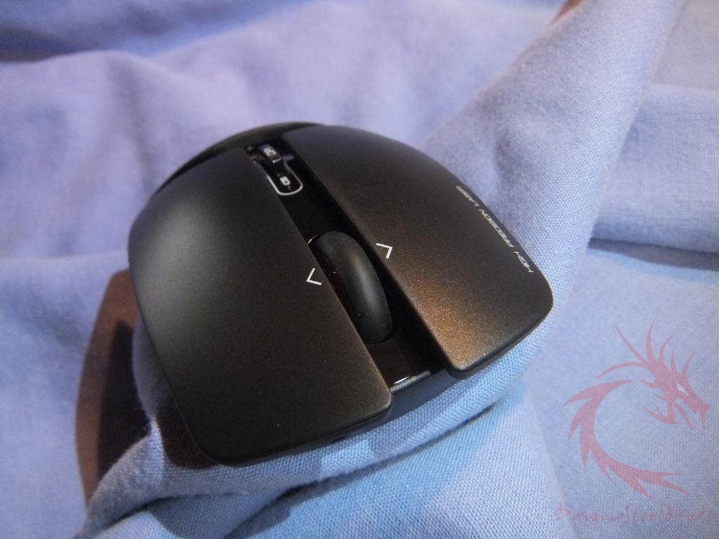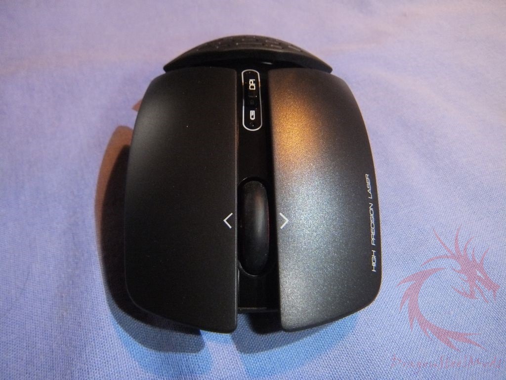 So here’s the mouse itself and it certainly is unique looking. On the top you’ll see a scroll wheel and behind that is the DPI button to change from 800 to 1600 whenever you want.