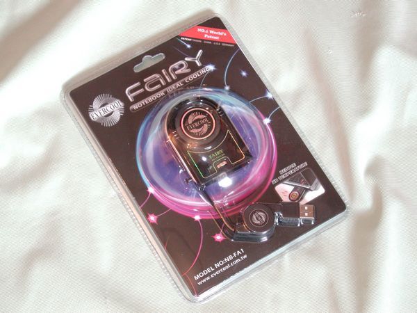 The Evercool Fairy comes packaged on a clear blister card with the notebook cooler centered on the front of a black card board insert.