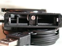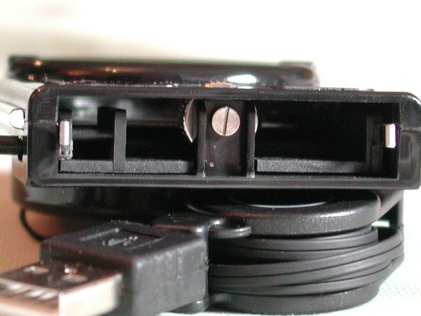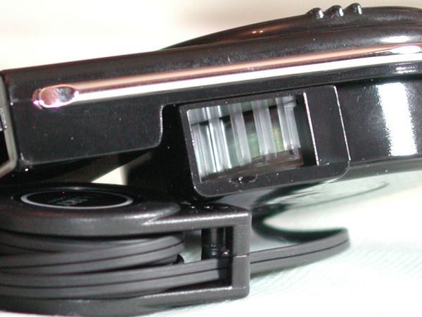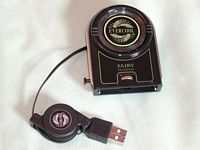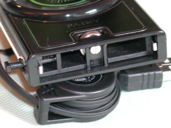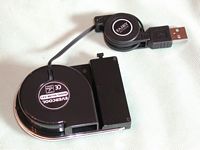 The Fairy comes in either black or white depending on the model number. The NB-FA1 model is mostly black with silver writing and accents. Coming off the left side of the device is a black USB plug attached to a retractor. Fully extended, the cable is about two feet long.