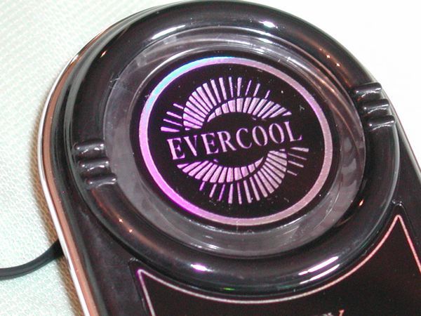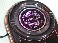 The fan is located under the circular Evercool logo and has an exhaust port on the right hand side. The side that attaches to the pc features two metal clips with a thumb wheel that extends or retracts the clips.