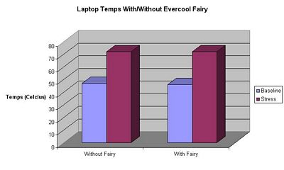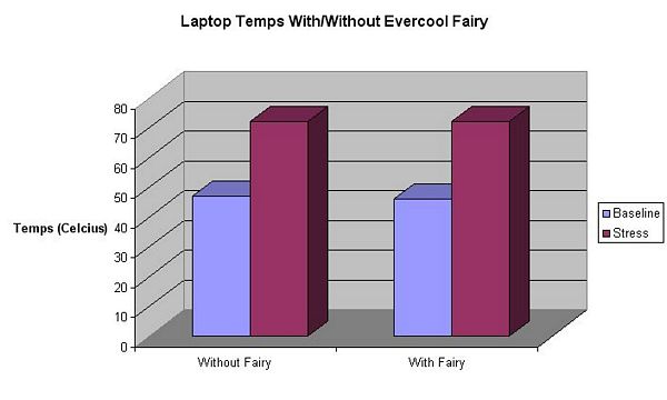 As seen in the graphs, there was little noticeable gain from using the Evercool Fairy on this particular laptop. Unfortunately, I did not have access to another laptop which fit the Fairy to perform further tests. Theoretically, it seems like the fan trying to suck some of the heat out of the laptops vents would not make a terrific improvement in terms of temperatures.