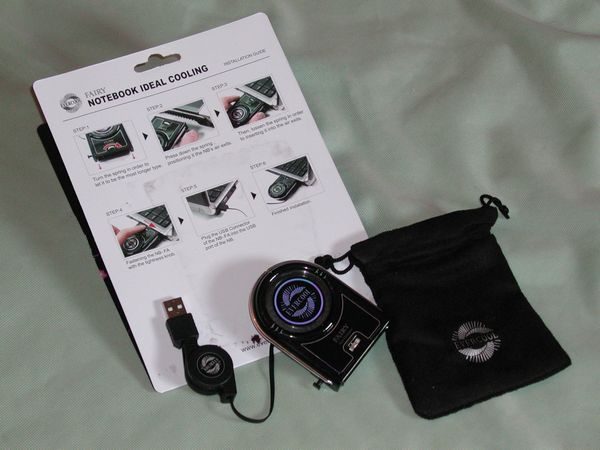 Once opened, the package contains the air extracting notebook fan, a velvet pouch for carrying the device and the instruction sheet.
