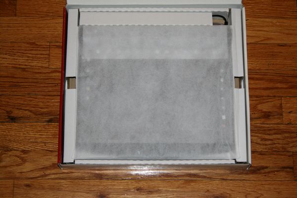 Upon opening the box, the F610 tablet is protected by a cloth sack. Underneath it, the pen, installation disks and pen holder are found.