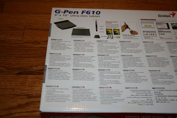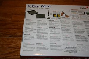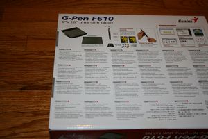 The Genius G-Pen F610 comes in a red and white box with the pen tablet featured prominently on the center of the box. In the background there is a digitized drawing of a woman in a field. The left hand side of the front lists some of the features of the F610.