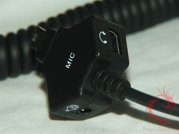The cord is nice and long, one end is a male HTC style mini-USB jack that of course plugs into your phone, and on the back side has two more jacks, one 3.5mm audio jack and a female mini-USB jack.