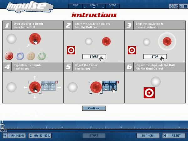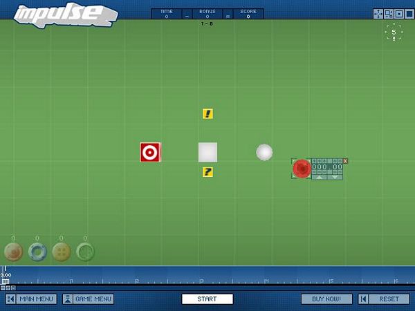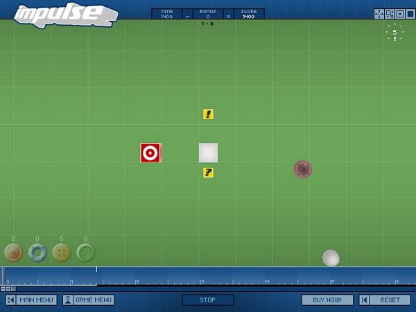 No movies here, more screenshots. Impulse is a very basic game, fun for a little bit but not much more than that. You put a bomb near a ball and try to get it to hit the target, that’s about it. Interesting, but not much replay value…