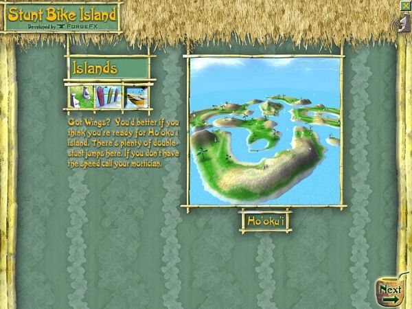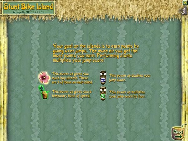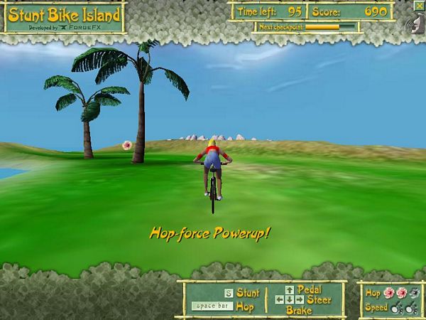 Description: Outrageous real-time 3D stunt-biking in a lush tropical setting! Spend a little quiet time on the islands launching yourself hundreds of feet into the air while pulling backflips, yahoos, deathboxes, tail whips and a boat-load of other insane stunts. Collect speed-boosts and other power-ups and jump over entire mountain ranges.