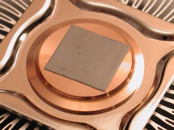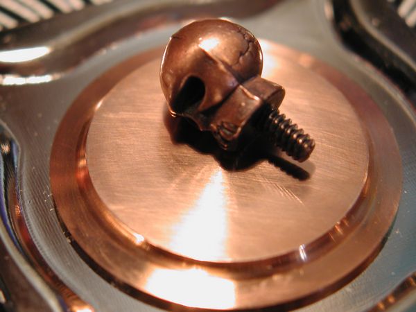 Flipping it over we can see a pre-applied thermal compound pad attached to a copper slug. There are four 'feet' that lock into the holes of your socket LGA 775 motherboard. I thought of trying this cooler out on my X2 but without modification it would be kind of hard to do.