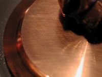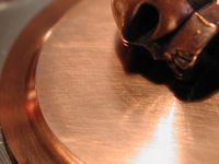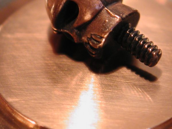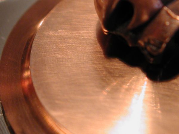 I stuck my macro lens on my camera to get in close to the base, if you run your fingernail across the base you can hear a faint tick-tick-tick, zooming in close you can see many machining circular lines. My guess is that the faint scratches we saw earlier are the attempt to 'lap' the base to get rid of these machining marks.