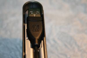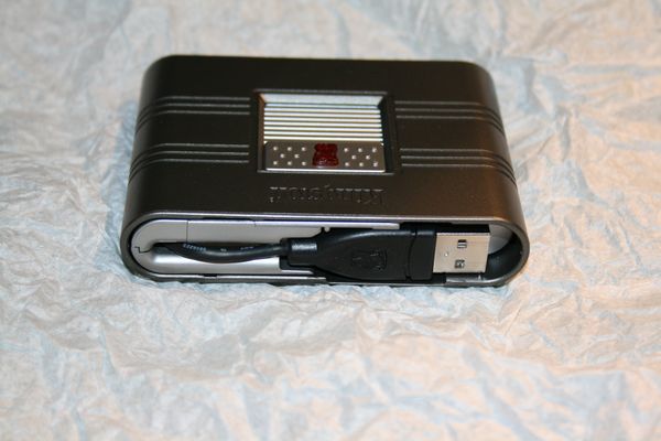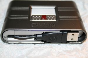 When the switch is slid forward, the front panel of the Card reader becomes accessible for media. The USB cord only extends out a distance of a couple of centimeters, so if you are hooking up to a desktop, the extender cable would be used, if you use a laptop, the short USB cable is perfect for easy access and portability. The bottom of the reader has rubberized pads to keep the device from sliding on ones desk.