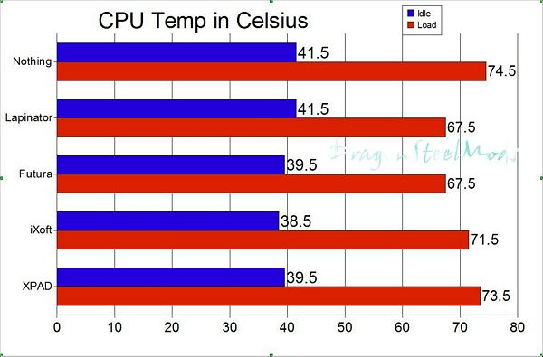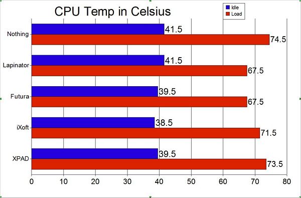 For the CPU temperature test I have Idle and Load temperatures recorded in the following graph. To get the idle temps I powered my laptop on, let it sit idle for 45 minutes. To find my load temperatures I ran Prime95 for 45 minutes as well. I used SpeedFan monitoring software to get the temperatures for the CPU. For all the testing of these products I powered my laptop off for one hour between each product, I did this for five days and averaged out the temperatures, I also alternated the order by which I tested the products as well from day to day. Ambient temperature during all testing was approximately 20.6C (+/- .2C)in the room.