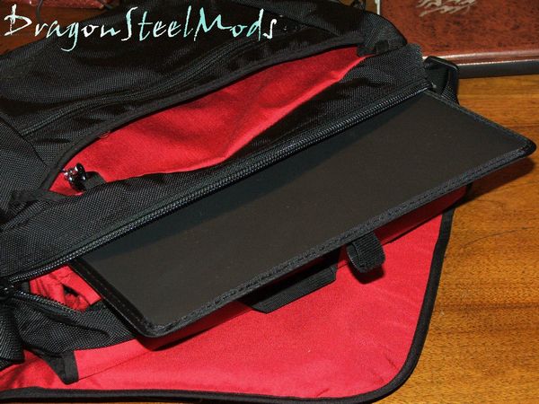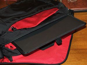Being small the Lapinator is portable, it will easily fit into most notebook bags, especially since the bottom can be squished to make it more compact. Here’s the Lapinator getting stuffed into my Tom Bihn ID Messenger Bag, it fits fine in there..