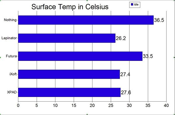 Next test is to test how well these products keep the heat away from your lap or legs. I used my Thermohawk 200 infrared thermometer to test the surface at several places under each product after the 45minutes of load testing, the highest temperatures recorded were used in the graph.