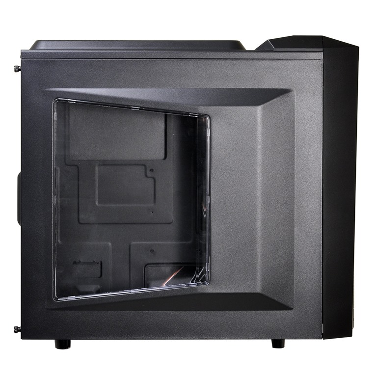 The “silent” model of the PC-K6 is virtually identical to the standard version, but with a few extra features. The PC-K6S uses sound-dampening foam inserts in the panels to isolate fan noise inside the chassis, mitigating its overall noise. The front panel on this version is hinged to swing open for easier access to the 5.25” bays and 120mm intake fans. It includes an extra USB 2.0 port, totaling two USB 3.0, two USB 2.0, and HD audio ports protected by a sliding metal cover.
