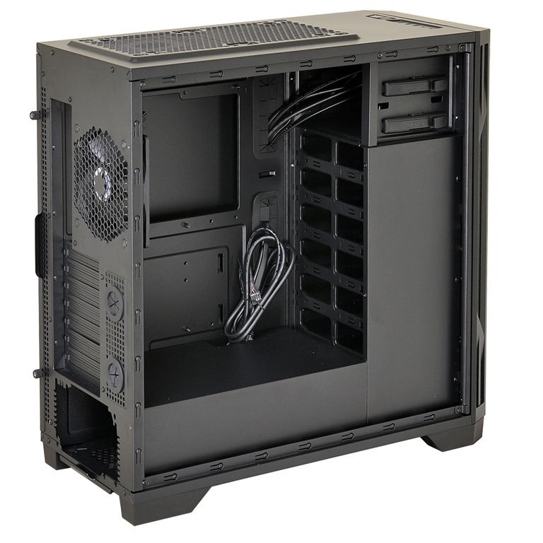 The PC-K5 is the first of the new Ebonsteel cases. It’s a mid tower chassis for ATX or mATX motherboards, including two removable drive cages storing a total of four 3.5” or four 2.5” drives. With seven expansion slots, builders can install VGA cards up to 250mm long with the cages installed, or remove one or both cages to install cards as long as 400mm. It accommodates 250mm ATX PSUs and CPU coolers up to 160mm tall. The PC-K5 uses two 120mm intake fans on the front panel and vents through a final 120mm fan in the back. Water cooling enthusiasts can mount a 120mmx240mmx60mm radiator on the top fan mounts, or simply add two additional 120mm fans. The front panel has two 5.25” bays and the top panel includes one USB 3.0, two USB 2.0, and HD audio inputs.