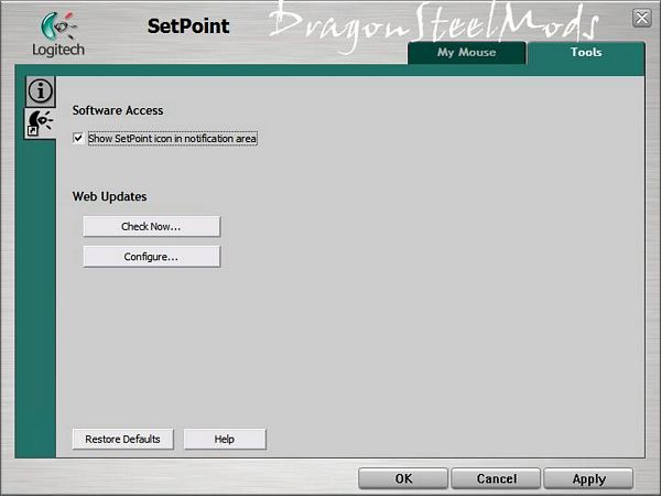 On the left side of the ‘Tools’ menu is another category or tab with the Logitech icon, this is to check for updates, configure how updates are handled and if you want to show the Logitech icon or not in your taskbar.