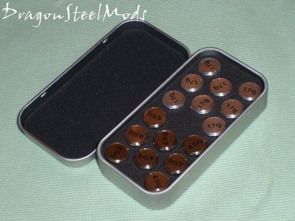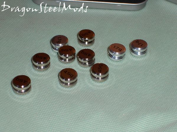 Inside the metal weight case we find sixteen small tuning weights, all snug in a foam, sponge like holder. There are only two different sizes of the weights 4.5grams and 1.7grams, or eight of each.