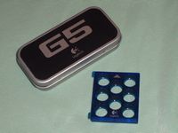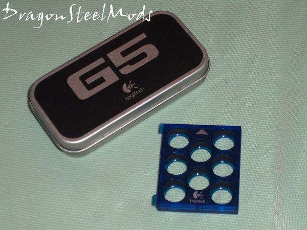 Included with the G5 is the user manual, driver/software disc, metal case with weights inside and the plastic weight holder. The original weight holder was orange, obviously this is blue in color to match the G5 coloring.
