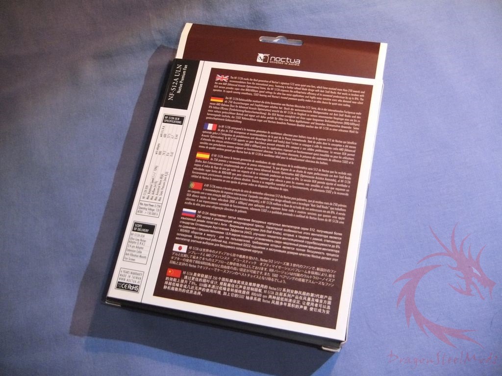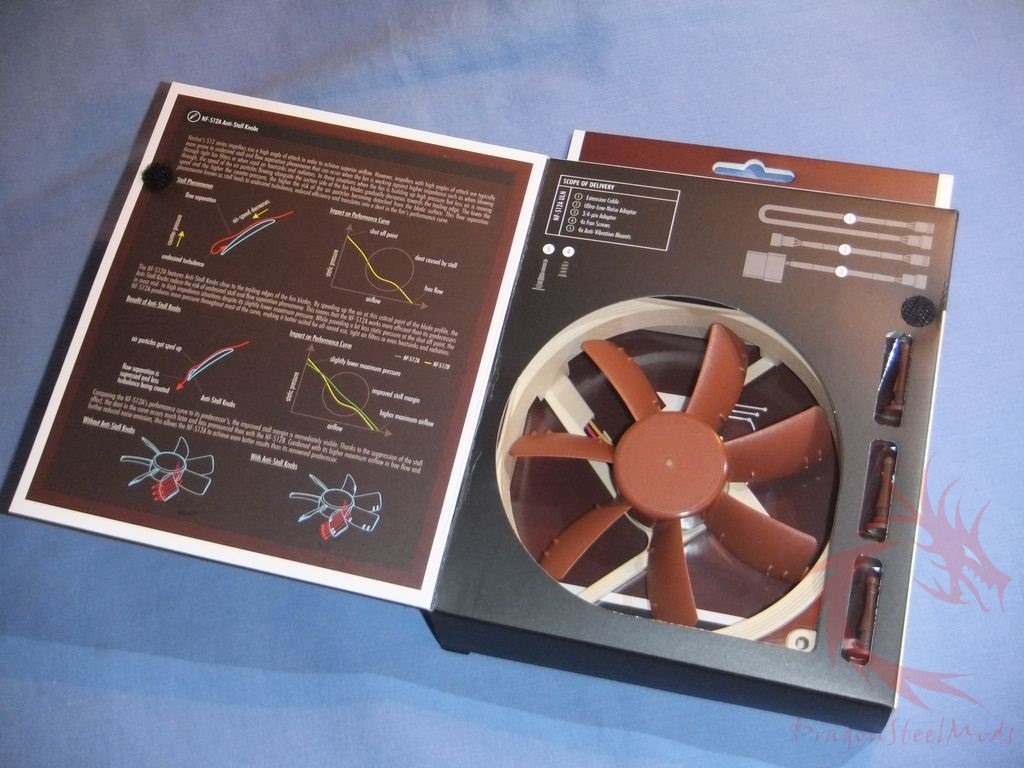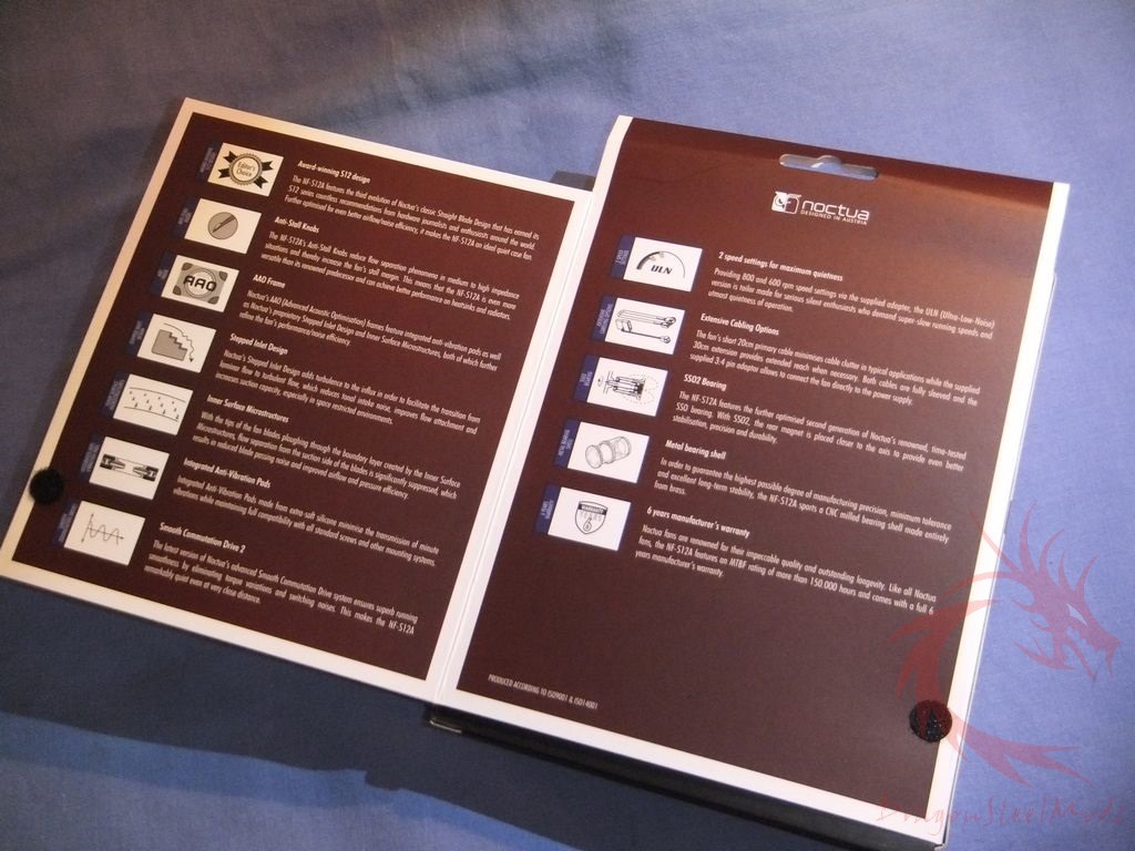 There are three fans in the NF-S12A series, and of course Noctua has many other fans as well and the packaging all looks pretty much the same. The box for the ULN fan opens up to show the fan on the right side and then some nice diagrams on the left side telling you more about the fan.