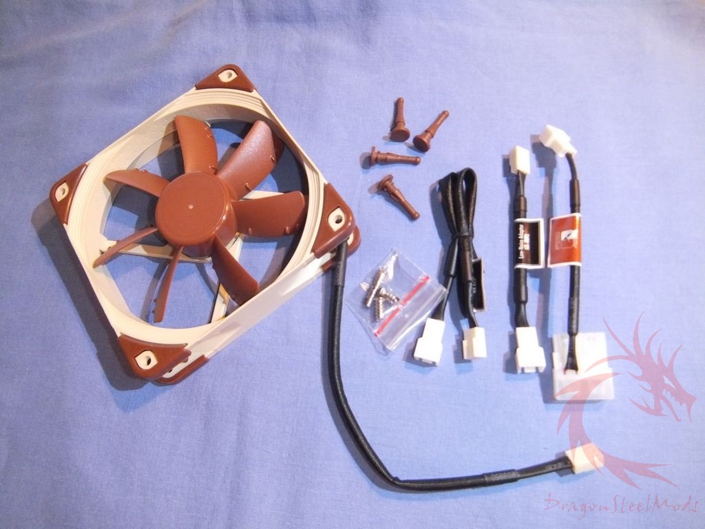Noctua included regular metal screws and silicone vibration dampening bolts. There is on low noise adapter included the NA-RC12 which slows the fan down to 600rpm from the stock 800rpm. Also included is an extension cable and a molex to 3pin adapter.