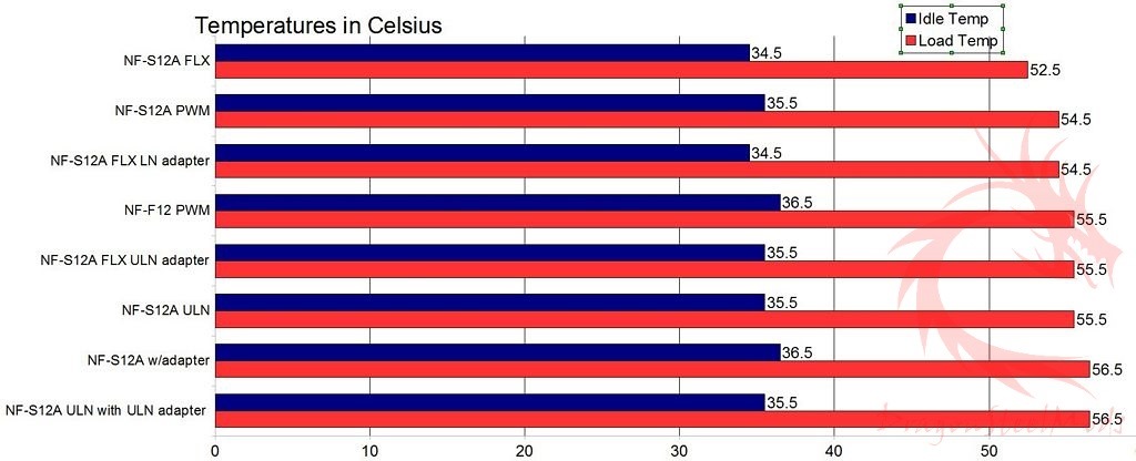 So as you can see pretty much all of the fans produce similar results. Running at 800rpm or 600rpm there’s only about a one degree difference.