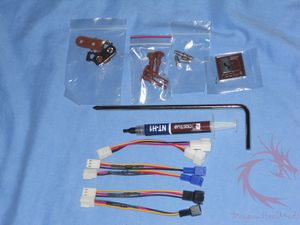 the fans in your case, an ‘L’ shaped screwdriver, four fan speed limiters and a