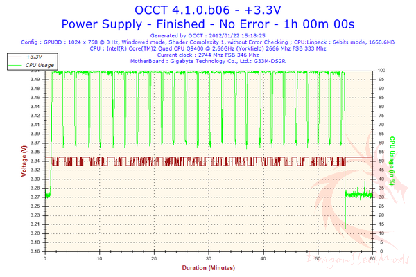 For comparison the voltages were measured using OCCT. Keep in mind the readings from software measured via the motherboard does not always provide the most accurate results as the 12V rail on OCCT came in over the 12.600 V range at 12.65 to 12.74. Otherwise the 3.3V and 5V rail were in spec as measured by OCCT.