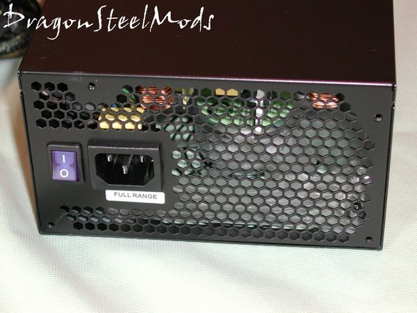 The rear of the OCZ GameXStream Power Supply has the now standard honeycomb style ventilation, and a blue colored I/O switch.