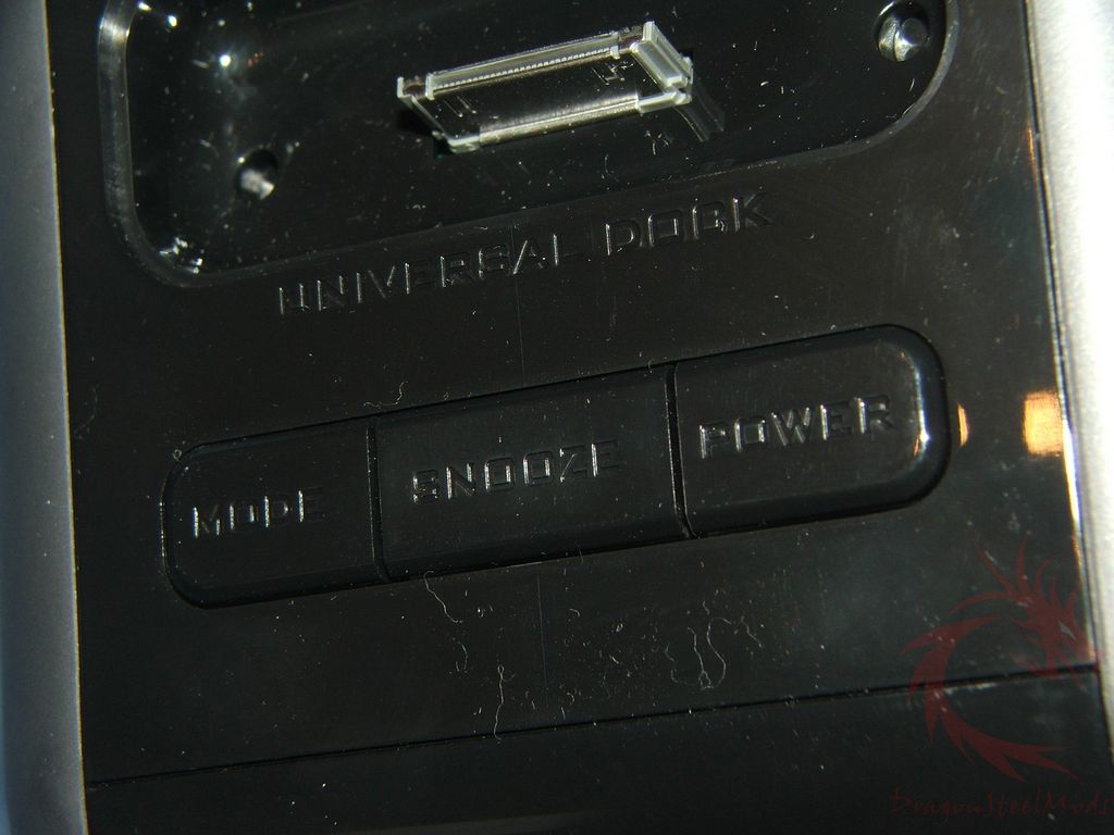 On the top you’ll find the iPod dock section with controls for Mode, Snooze and Power. The Mode button just changes between Line in, Radio and iPod input.