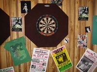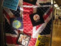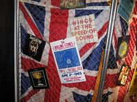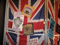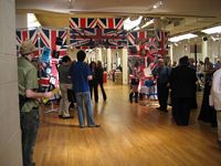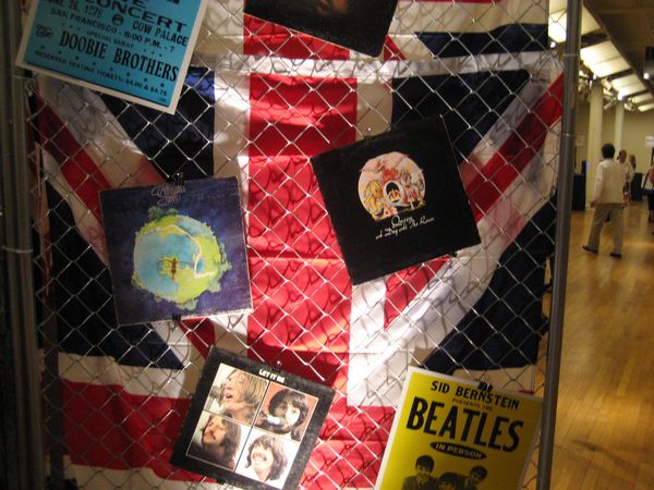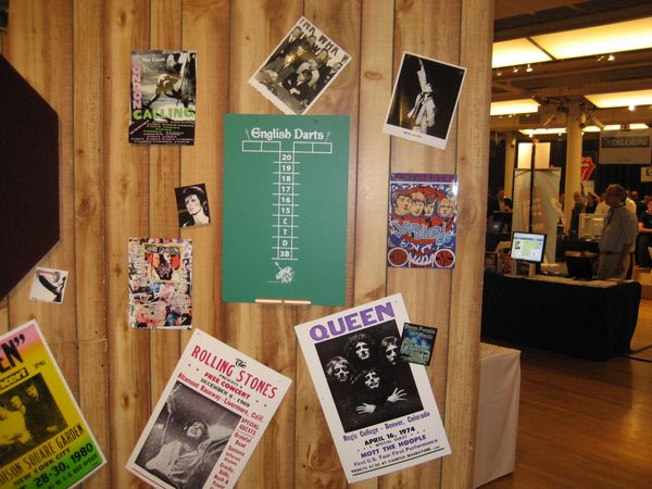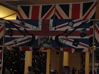 The event hall was a spacious area which had a New York City art exhibit appearance; it featured white columns interspersed throughout the area. The theme for the event was the British Invasion and featured many Union Jack Flags, concert posters from various British bands, a pub, a dart throwing area and a live band playing various tunes fitting the theme of the event.