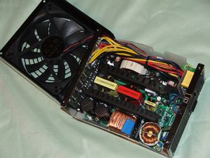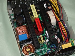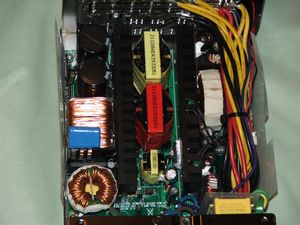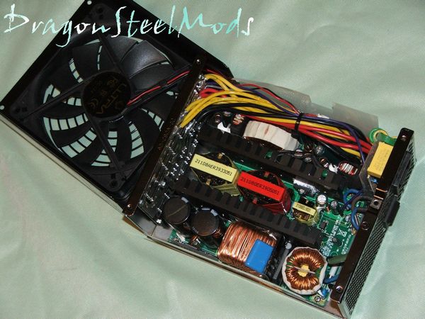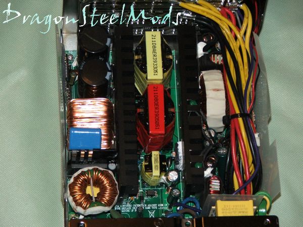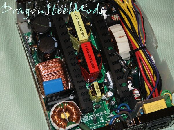 The first thing you'll notice is just how large the components are inside, nice large industrial sized components. The next thing you'll notice is how small the heatsinks are, I was expecting massive heatisnks inside but when you look at how large the fan is you can sort of understand the lack of large heatsinks. As I mentioned before the fan takes up most of the bottom of the power supply thus providing a lot of airflow across everything to keep it all cool.
