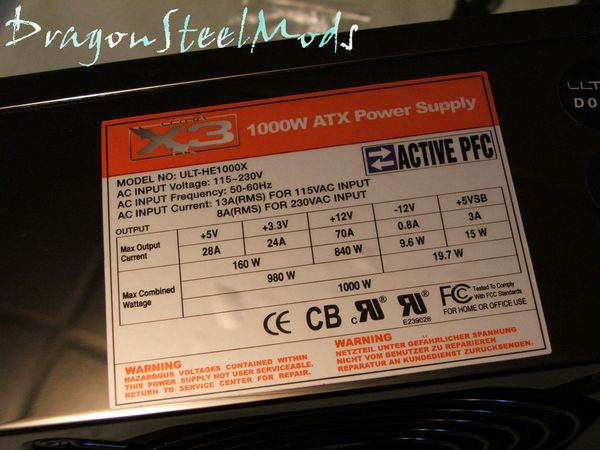 The Ultra X3 1000Watt is a thing of beauty actually, if a power supply can be called beautiful then this one can. The finish is excellent, but just watch those fingerprints, while I was taking pictures I had to keep wiping it clean so they wouldn't show up in the pictures.. though I'm sure I might have missed a few. Like any power supply on one side is the specifications label telling us all the particulars about the X3.