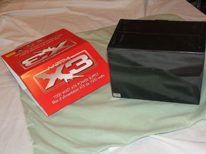 The power supply itself is large, so one would expect it to come in a large box, but the box for the X3 100Watt PSU is huge actually, I was shocked by it's sheer size. There is a cardboard slipcover over the actual box that has a flip open part that give you a brief review of the specs and features of the X3 that's inside.