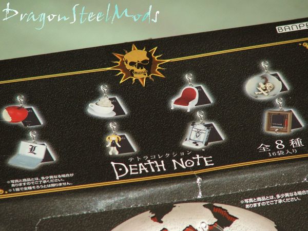 Each collectible cellphone charm comes with a Death Note and little pamphlet.