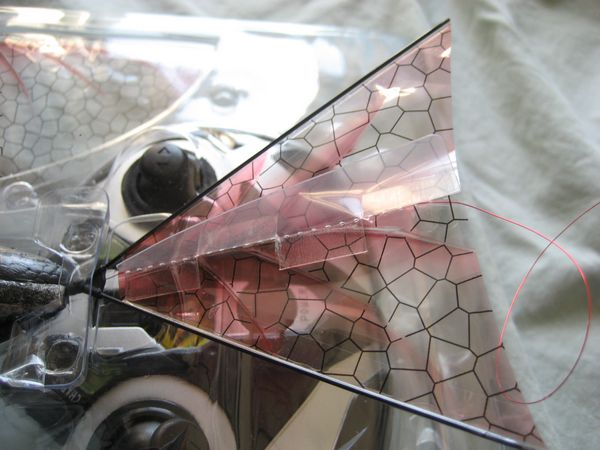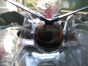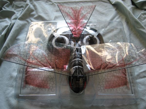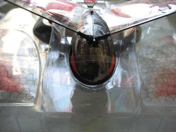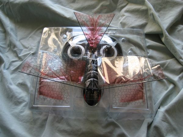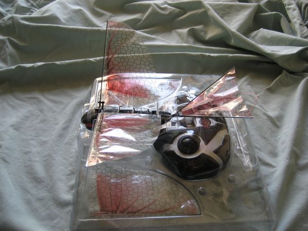 On the underside, the power switch and charging input can be found. The wings are clear with a black honeycomb pattern and a reddish picture, which is designed to represent the skeleton of the wings.